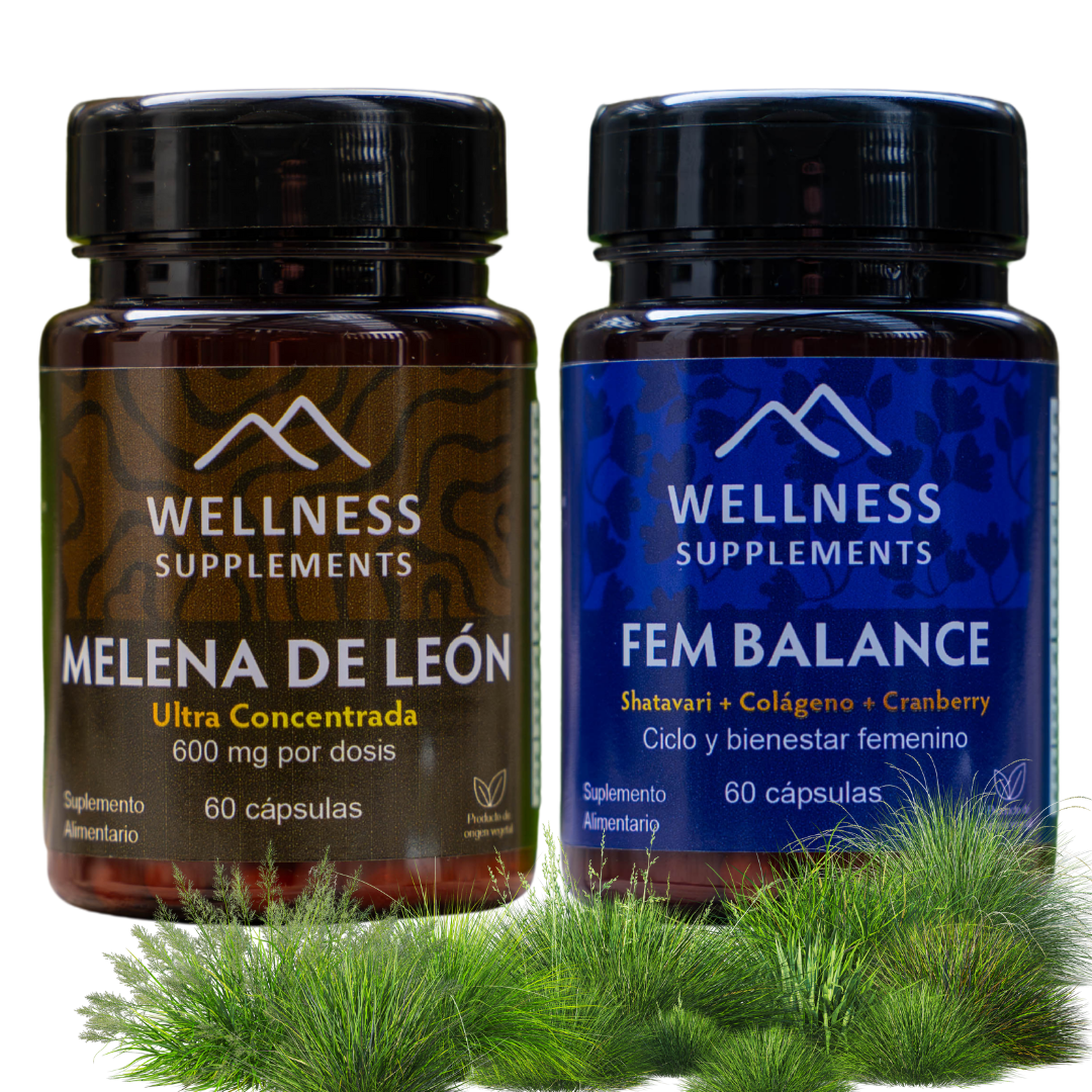 Cuando tu cuerpo y mente piden un respiro, este pack responde con lo mejor de la naturaleza. El Pack Bienestar Femenino une dos fórmulas pensadas para mujeres que quieren sentirse bien en cada etapa de su ciclo: Fem Balance, para apoyar tu sistema hormonal y realzar tu energía femenina, y Melena de León, para darte foco, claridad y un estado mental más sereno.
