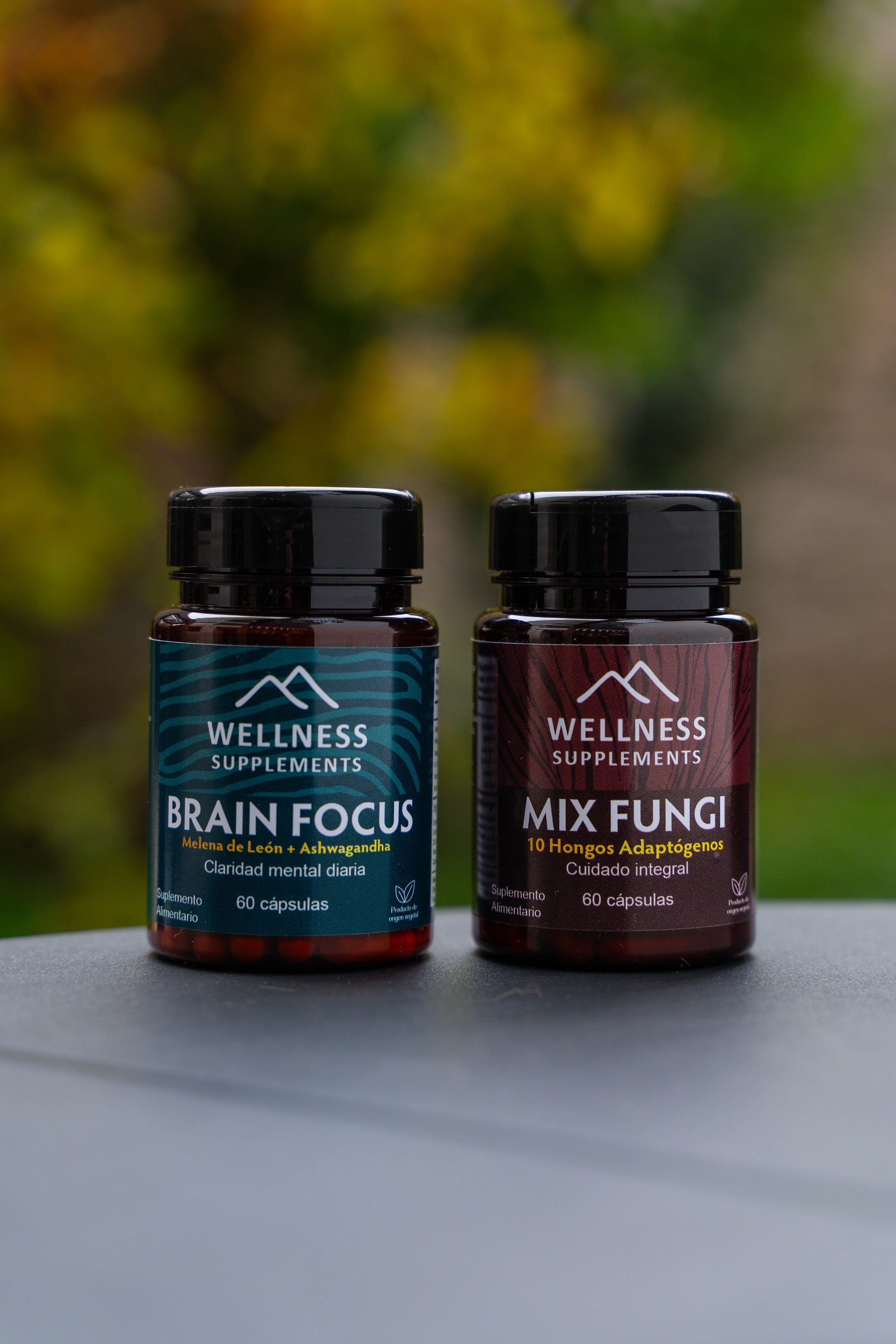 • Brain Focus: Melena de León, Colina, L-Teanina, Ashwagandha y Vitaminas B.