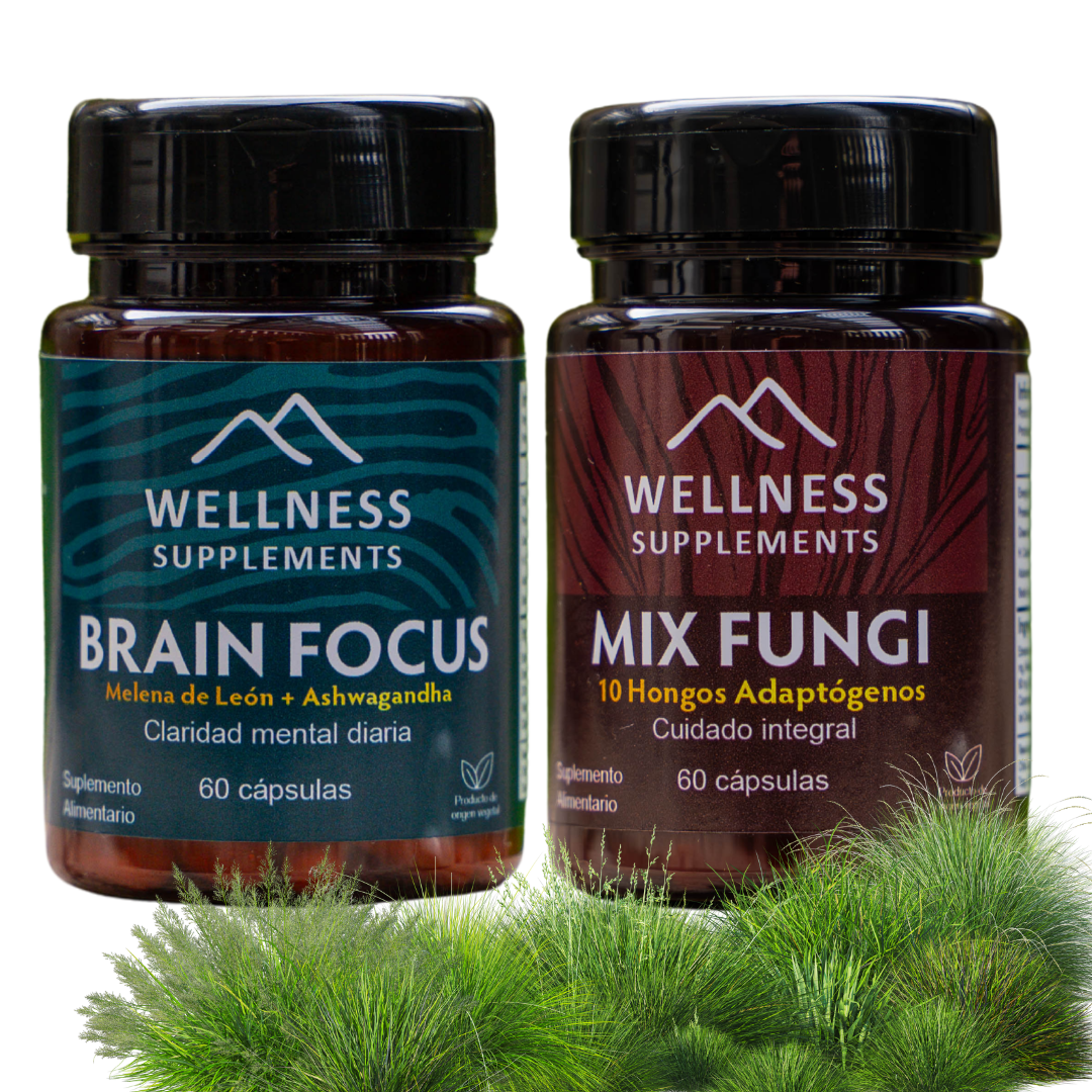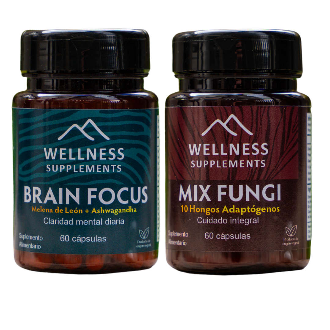 El Pack Foco y Defensa fue diseñado para quienes necesitan claridad mental sin agotarse y un sistema inmune fuerte para seguir el ritmo de la vida. Brain Focus potencia tu concentración y productividad, mientras que Mix Fungi refuerza tus defensas con 10 hongos funcionales que apoyan tu energía desde adentro.