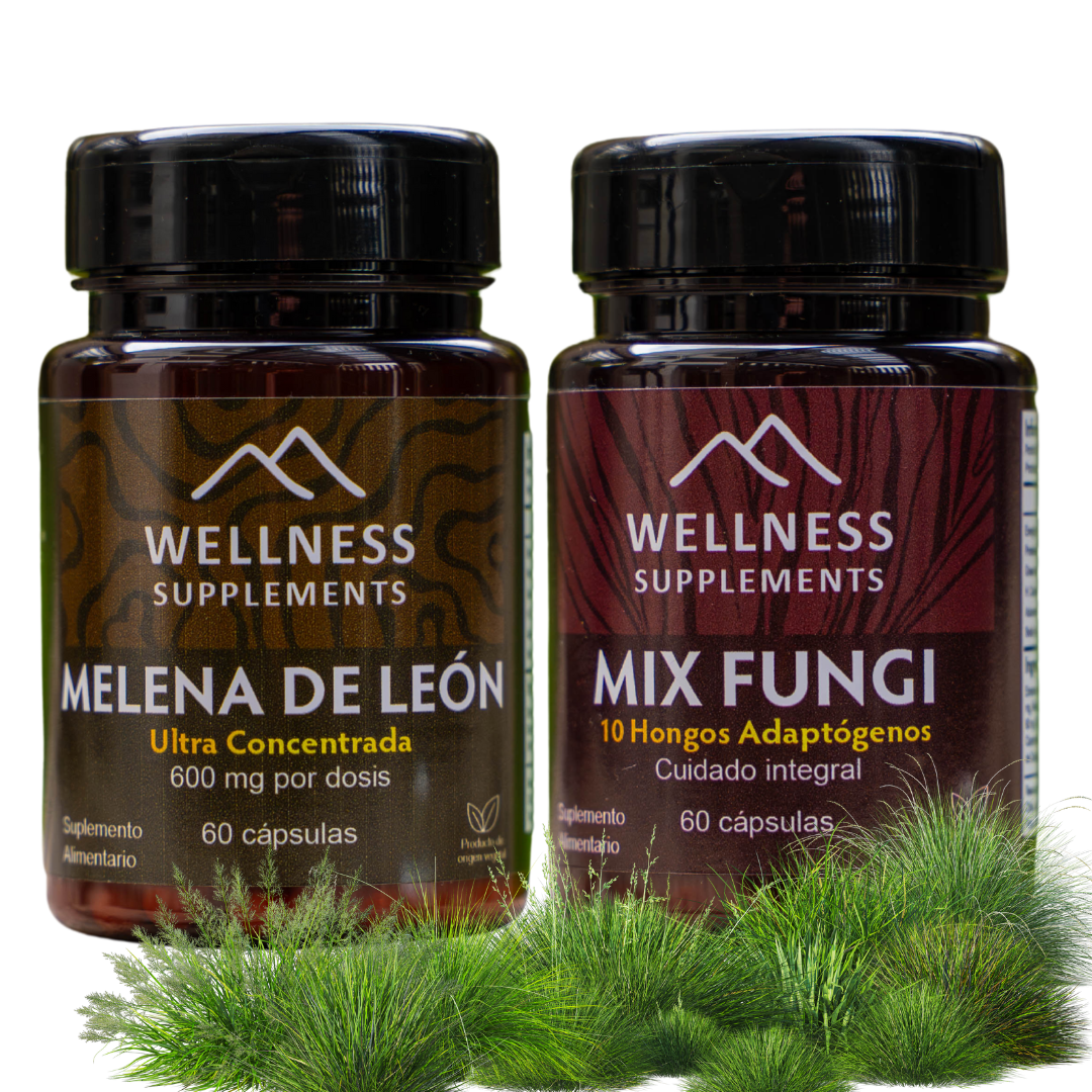 El Pack Fungi combina dos fórmulas poderosas basadas en hongos funcionales y neuroregenerativos: nuestro Mix Fungi, con 10 adaptógenos naturales para el equilibrio físico y emocional, y Melena de León Concentrada, el hongo nootrópico por excelencia para claridad mental, memoria y foco sostenido.